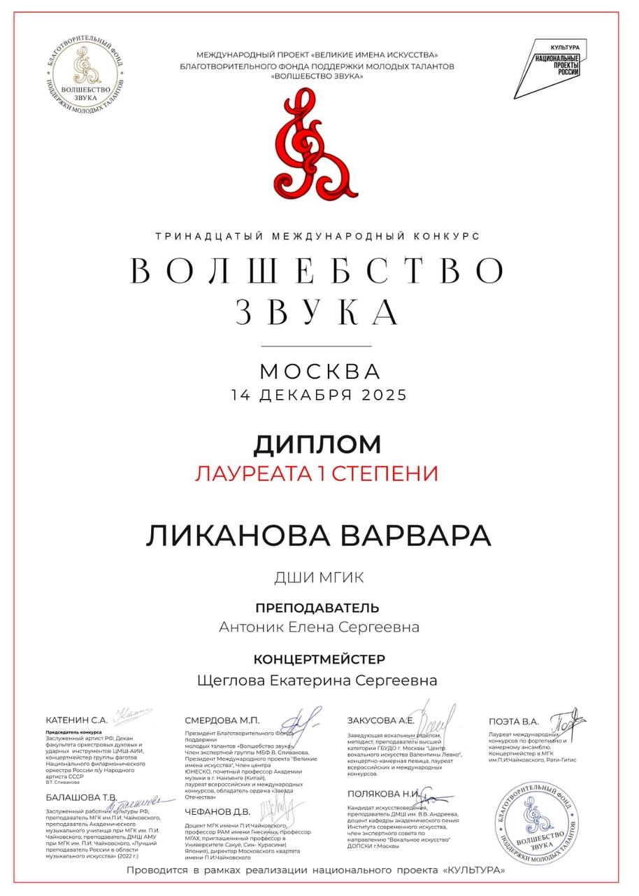 14 декабря в ГБУДО г. Москвы «Детская музыкально-хоровая школа имени И.И. Радченко» состоялся XIII Международный конкурс «Волшебство звука». Прослушивания проходили в очном формате. Ученица 2 класса Детской школы искусств МГИК – Ликанова Варвара, награждена Лауреатом 1 степени в номинации «Духовые и ударные инструменты».