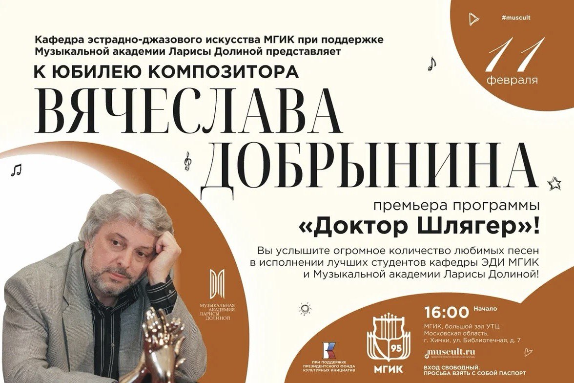 11 февраля 2026 года в большом концертном зале Московского государственного института культуры (МГИК) пройдёт концерт-трибьют, посвящённый 80-летию со дня рождения композитора и народного артиста России Вячеслава Добрынина. Мероприятие организовано кафедрой эстрадно-джазового искусства института при поддержке Музыкальной академии Ларисы Долиной и Президентского фонда культурных инициатив.